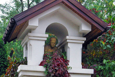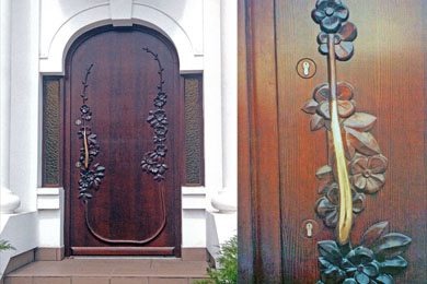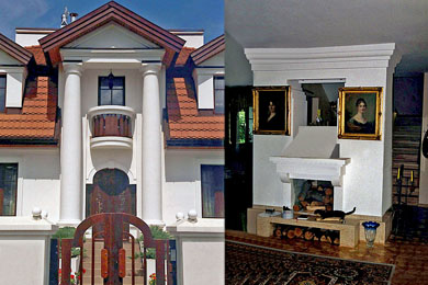 Budynek zwieńczyłem długim klasycyzującym kominem. Architekturę dworu dopełniłem kryjącym mezzanino dwukondygnacyjnym gankiem wejściowym opatrzonym parą doryckich kolumn i zwieńczonym tympanonem wspartym na antykizującym belkowaniu. Tamże tradycyjnie umieszczone pod niewielkim półokrągłym balkonem drzwi wejściowe przekryłem łukiem koszowym, zaś ich powierzchnię ozdobiłem wyrzeźbionymi w drewnie malwami uzupełnionymi popychaczem odlanym z mosiądzu w kształcie kwietnej gałązki. Balustradę balkonika w mezzanino zwieńczyłem szeroką, wręcz pulpitową wykonaną z żelbetu samonośną poręczą. W miejscu tralek umieściłem ciemne drewniane bryły. Na środkowej z nich znalazła swe miejsce inskrypcja z datą powstania budynku. W podobny sposób zrealizowałem balustradę tarasu na piętrze. Kształt zespołu wejściowego uzupełniła drewniana furta. Powtórzyłem w niej łuk koszowy zastosowany w drzwiach. Na parterze w centrum wnętrza dwa słupy konstrukcyjne powiązałem nietypowym kominkiem nadając kompozycji antykizujący charakter. Całość przestrzennego układu działki zamknęła umieszczona w jej narożu przydrożna kapliczka poświęcona błogosławionemu ojcu Janowi Beyzymowi powiązanemu koligacyjnie i ze mną i z inwestorem. Jego figurę z Murzynkiem na kolanach oraz malwy na drzwiach wejściowych wyrzeźbiła moja córka, architektka wnętrz Marta.