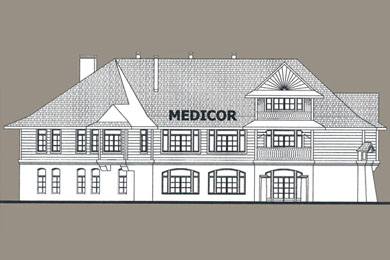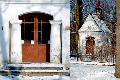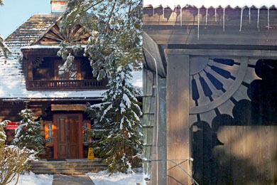 Mając tak świetny wzór pozostało mi jedynie połączyć płynącą zeń inspirację ze współczesnymi wymogami funkcji i aktualnym stanem techniki budowlanej. Zaprojektowałem budynek dwukondygnacyjny osłonięty stromym wielospadowym o wydatnych okapach dachem krytym gontem. Biały murowany parter wsparł ciemne drewniane piętro obłożone drewnianymi belkami nawiązującymi do stosowanych niegdyś płazów. W środkowym trójkondygnacyjnym ryzalicie fasady umieściłem główne wejście zainspirowane kapliczką z Granicy. Dwie skromne kolumienki przykryłem sklepiennym łukiem. Zastosowałem też podział szkleń zbliżony do występujących we wspomnianej kapliczce. Wykusz pietra wsparłem na wydatnych mbiałych wspornikach. Eksponowany narożnik budynku opatrzyłem murowaną parterową skarpą zwieńczoną niewielką kapliczką. W szczytach dachów znalazły swe miejsca podhalańskie słoneczka. Pozostałe drewniane detale wachlarzy, wsporników i balustrad oparłem na inspiracjach zainwentaryzowanych w wyżej wspomnianym zespole leśnej zabudowy w Granicy.
