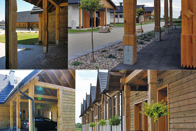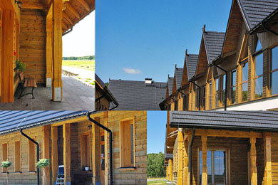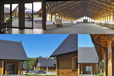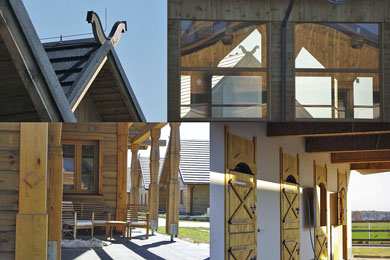 Zakorzenienie w bogatej spuściźnie architektury kurpiowskiej oparłem na możliwie szerokim nawiązaniu do dawnych form lokalnej zabudowy. Idąc za niedoścignionym przykładem Stanisława Witkiewicza prace projektowe poprzedziłem staranną inwentaryzacją wielu elementów zabudowy zgromadzonej w pięknym nowogrodzkim skansenie. Ku memu zaskoczeniu okazało się, że kurpiowska ciesiołka oraz tamtejsze zdobnictwo swą mnogością parokrotnie przewyższały ich pierwotnie dobrze mi znane i cenione podhalańskie odpowiedniki. W ślad za tym gros budynków opatrzyłem tradycyjnymi drewnianymi elewacjami wykończonymi w naturalnym kolorze i wzbogaconymi mnogością kurpiowskich detali: śparogów, korun, opraw okiennych i drzwiowych, belek szczytówek, wiatrownic, rozlicznych typów szalowania szczytów, słupów, balustrad, etc., etc. W stajennym założeniu zaprojektowałem również rozmieszczenie wielu elementów kurpiowskiej kultury. Wysmukła kapliczka na osi głównego dziedzińca, rzeźbiona brama wjazdowa, barcie, brogi, ozdobne ptasie budki, czy wreszcie studnia z żurawiem w projektowym zamyśle miały zostać uzupełnione zabytkowymi ruchomościami.