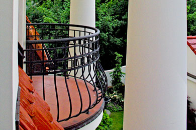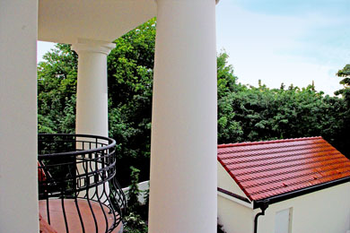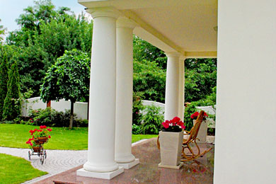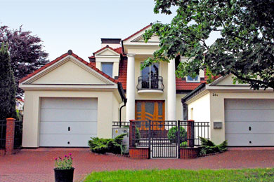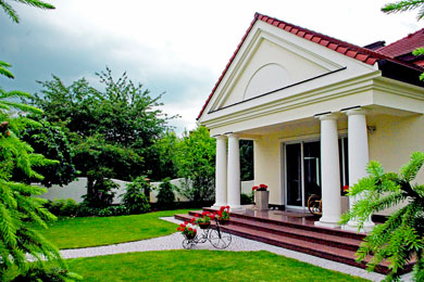W Wilanowie przy ul. Królowej Marysieńki 24E miałem do dyspozycji działkę o sporej powierzchni 1000m2, ale bardzo wąską o przylegającym do ulicy froncie szerokości ca 17.5m. Chcąc wykorzystać smukłość terenu od strony ulicy zaprojektowałem położone symetrycznie względem osi założenia dwa garaże stanowiące w mej koncepcji mini dworskie oficyny. Na oś kompozycji kolejno nanizałem sześć przestrzeni - dziedzińczyk wejściowy pomiędzy wspomnianymi mini oficynkami, ganek wejściowy oflankowany dwiema w wielkim porządku doryckimi kolumnami i oczywiście zwieńczony tympanonem, sień wejściową sklepioną kolebą o przekroju łuku koszowego i oświetloną dwoma oknami w kształcie dużych wolich oczu oraz ozdobioną dekoracyjnie ukształtowanymi schodami, reprezentacyjny salon, ganek ogrodowy z czterema doryckimi kolumnami wspierającymi duży tympanon, zamykający układ ogród. Właściwy dwór nakryłem tradycyjnym dachem polskim łamanym. Wielu detali nie udało mnie się wystarczająco dopieścić, ale podstawowe założenia zostały zrealizowane.